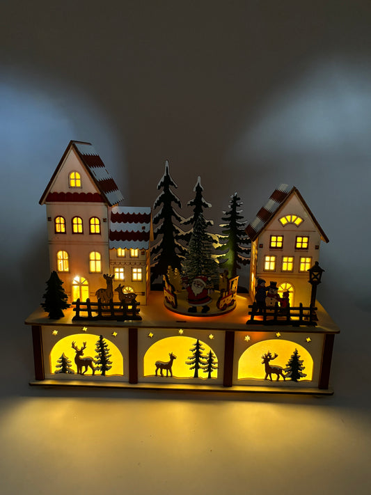 Village de Noël en bois lumineux et musical à piles (27 x H22 cm) Cœur du village Coloré