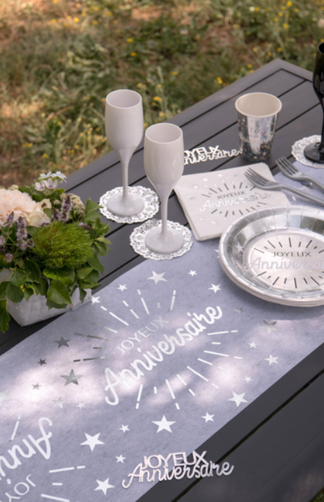 Chemin de table intissé anniversaire blanc et argent 5m x 30 cm