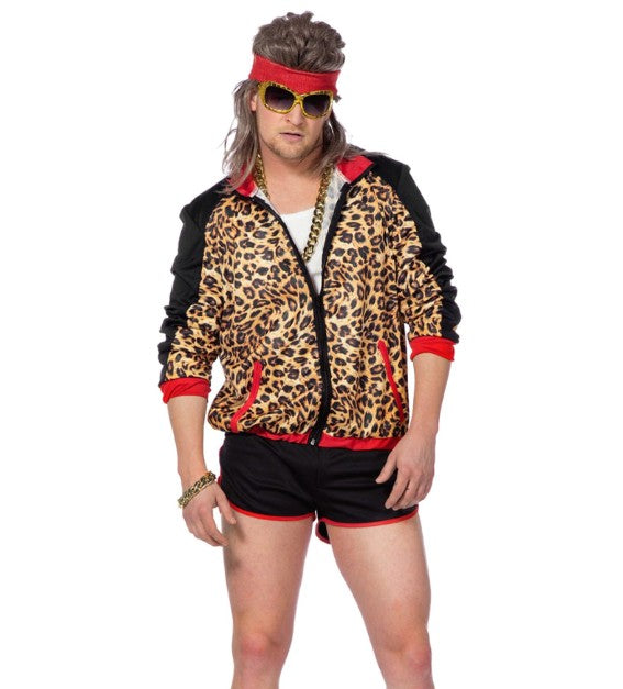 Ce déguisement années 80 imprimé léopard pour homme inclut une veste zippée et un short assorti, pour un look décontracté et excentrique fidèle à la mode délirante de la décennie.
