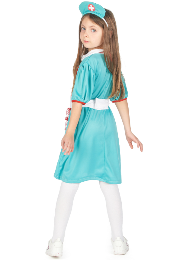 La robe est verte, avec un tablier blanc sur lequel est cousu une croix, et des liserés rouges au niveau des extrémités. La tenue comprend également une coiffe assortie (Seringue et chaussures non incluses).