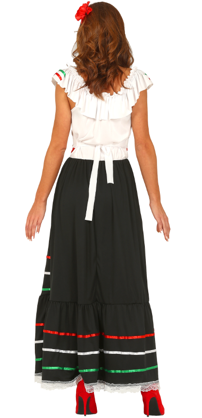 Ce déguisement de Mexicaine pour femme se compose d'une robe (barrette, collier et chaussures non inclus). Le haut de la robe est blanc, avec des liserés rouges et vert au niveau de l'encolure.