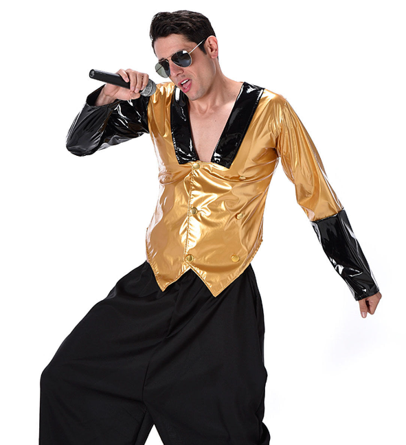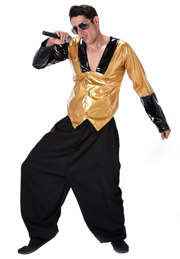 Ce déguisement de rappeur célèbre des années 80 est composé d'un pantalon noir avec taille élastique et d'un haut doré à détails noirs.