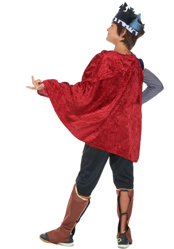 Ce costume est agrémenté de nombreux accessoires. Une cape rouge effet velours et une ceinture marron à scratch complètent l'esemble et lui donnent du prestige. Une coiffe représentant une couronne en tissu noir brillant renforce l'aspect royal du déguisement. Enfin, des sur-bottes marron aux liserés or maintenues aux jambes et sous les pieds par des élastiques terminent le tout.