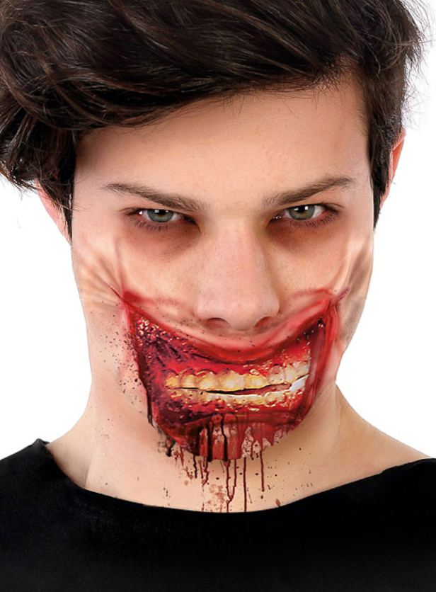 Souriez de bonheur ou plutôt de terreur avec cette fausse cicatrice ensanglantée pour mâchoire...