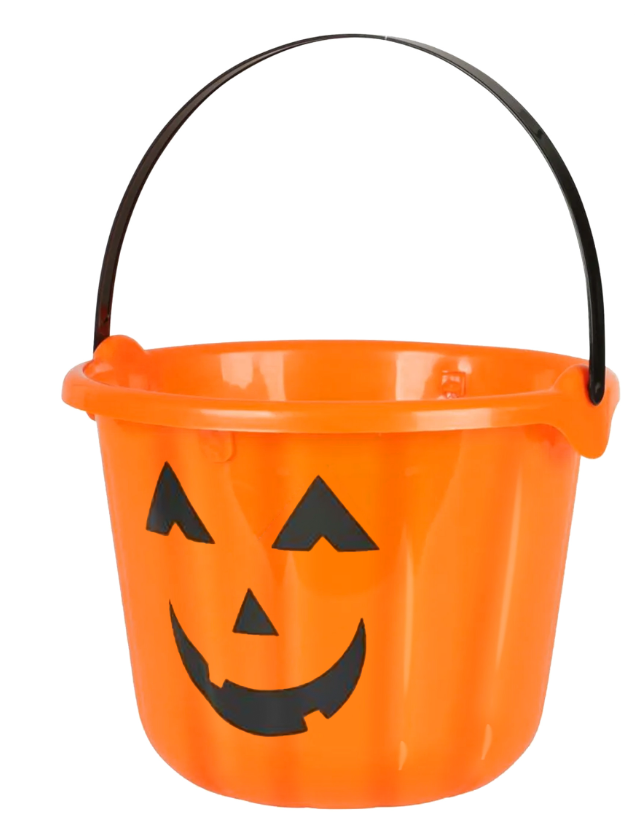 Ce seau citrouille, de couleur orange et noir comprend une anse pour le tenir à la main.