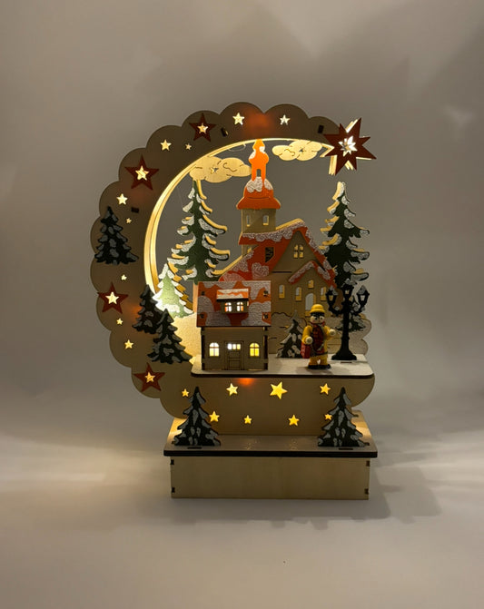Village de Noël en bois lumineux et musical à piles (27 x H22 cm) Cœur du village Coloré