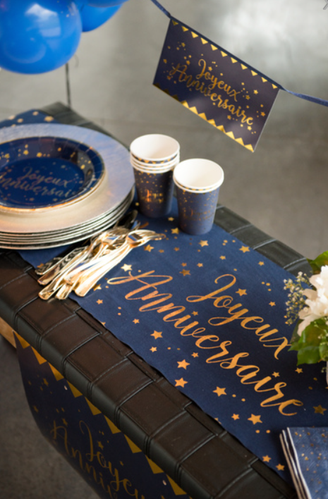 Chemin de table coton joyeux anniversaire bleu et or 28 cm x 3 m