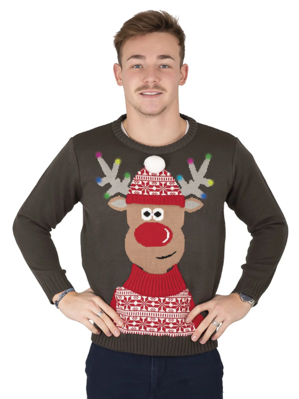 Sur fond gris, ce pull illustre un renne de noël avec un gilet et un bonnet rouge. Il possède également un grand nez rouge puis ses bois sont des décorations lumineuses fonctionnant avec des piles. Le pull possède également un bouton musical pour plus de folie !