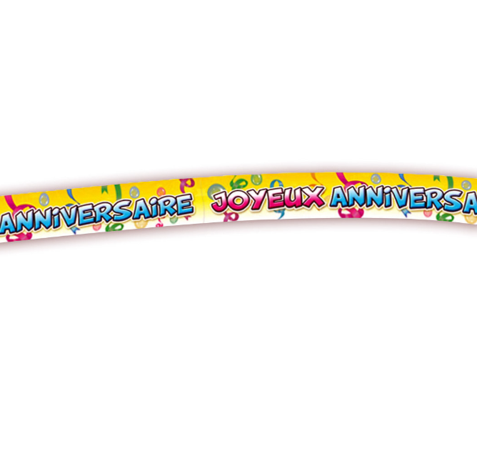 Les inscriptions "JOYEUX ANNIVERSAIRE" en rose et bleu apparaît sur tout le long de cette bannière et des motifs au thème festif tels que cotillons, serpentins et ballons multicolores sont également imprimés