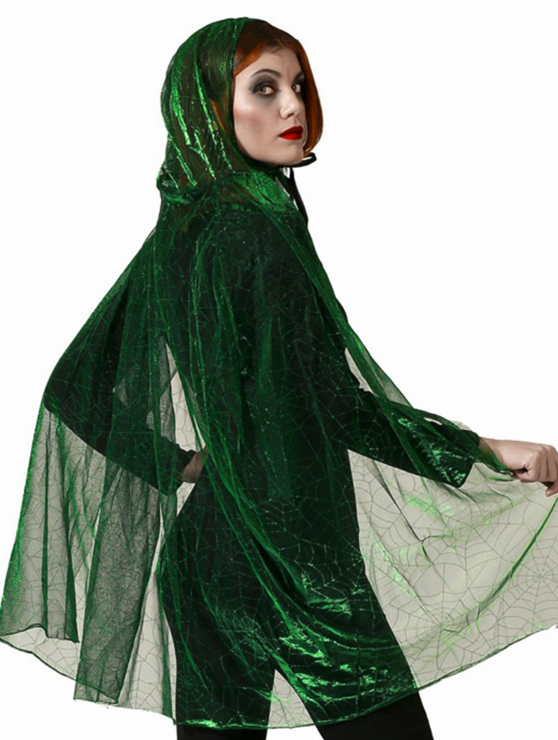 Cette cape verte à capuche toile d'araignée pour adulte est l'accessoire parfait pour compléter votre tenue de sorcière ou de créature mystique.