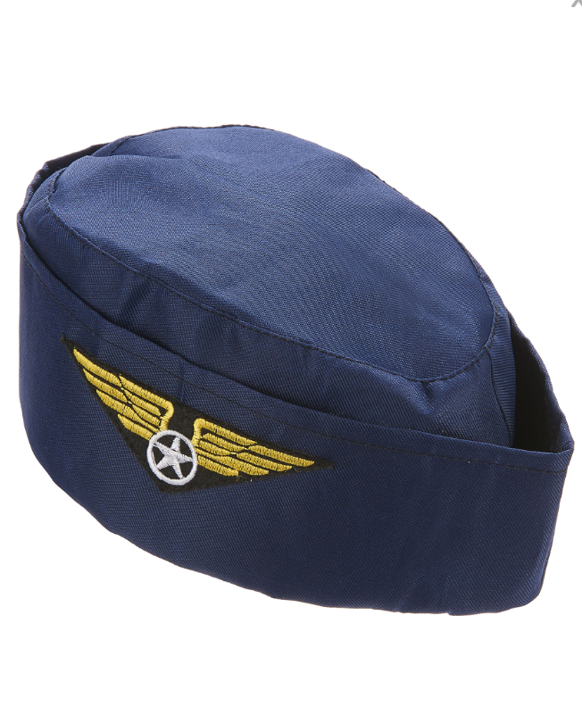 Ce chapeau bleu marine d'hôtesse de l'air est orné d'un logo représentant une étoile blanche entourée de deux ailes jaunes.