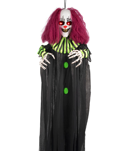 Faites surgir la peur du plafond avec ce clown suspendu animé de 130 cm environ, un personnage macabre aux couleurs vives qui n’a rien d’amusant. Avec sa chevelure rouge ébouriffée, son costume vert fluo et noir, et son visage osseux figé dans une grimace dérangeante, il attire tous les regards.