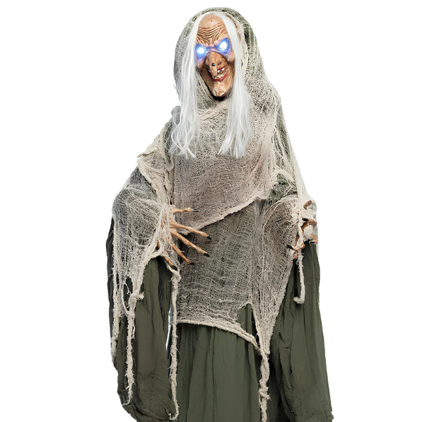 Cette sorcière animée de 153 cm environ répond au nom d’Andromeda, une figure inquiétante vêtue d’une longue robe verte fanée et d’un châle effiloché à l’aspect ancien. Son visage marqué par le temps, surmonté d’un regard bleu lumineux, prend vie dès qu’un bruit est détecté.
