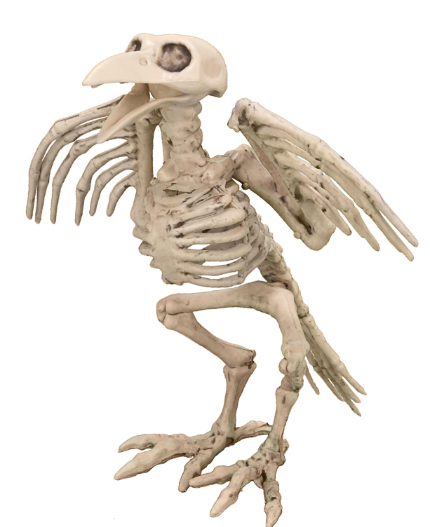Cette décoration mesure environ 19.5 cm de hauteur et représente un squelette de corbeau en plastique.