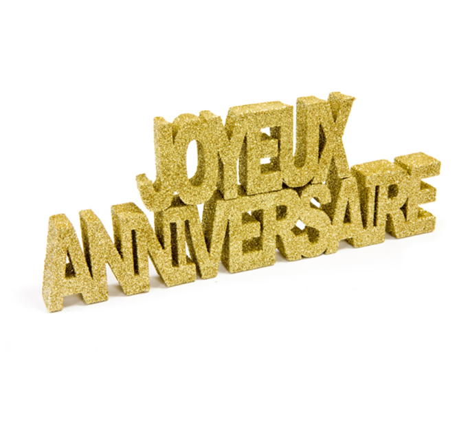 Entièrement recouverte de paillettes dorées. Les deux paroles sont détachables afin de créer la décoration que vous désirez : superposées ou en ligne. Elles mesurent environ 9 x 3.5 x 1.5 cm ("joyeux") et 19 x 3.5 x 1.5 cm ("anniversaire").