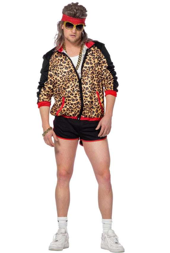 Ce déguisement années 80 imprimé léopard pour homme inclut une veste zippée et un short assorti, pour un look décontracté et excentrique fidèle à la mode délirante de la décennie.