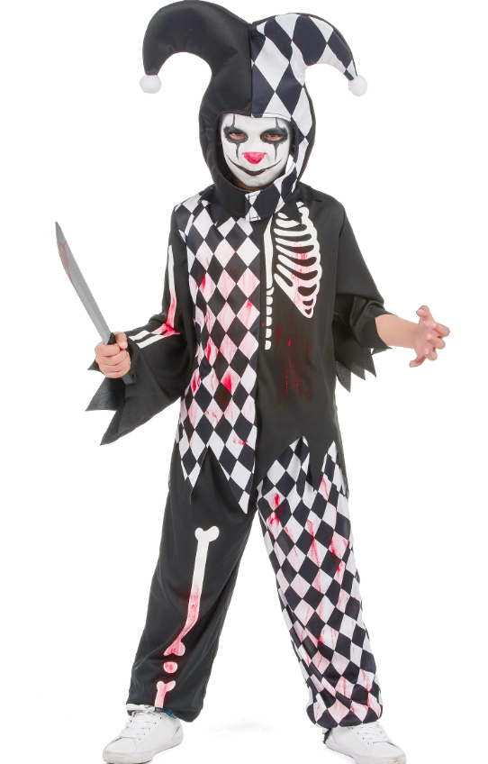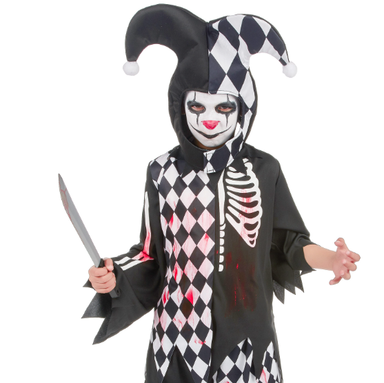 Ce déguisement d'arlequin ensanglanté pour garçon comporte un haut, un pantalon et un chapeau.