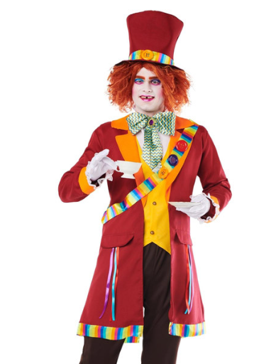 Déguisement chapelier fou homme. Comprend un chapeau, un col, un nœud papillon, une veste, une bandoulière, un pantalon, un gilet. N'inclut pas la perruque, les gants, la tasse, les chaussettes ou les chaussures