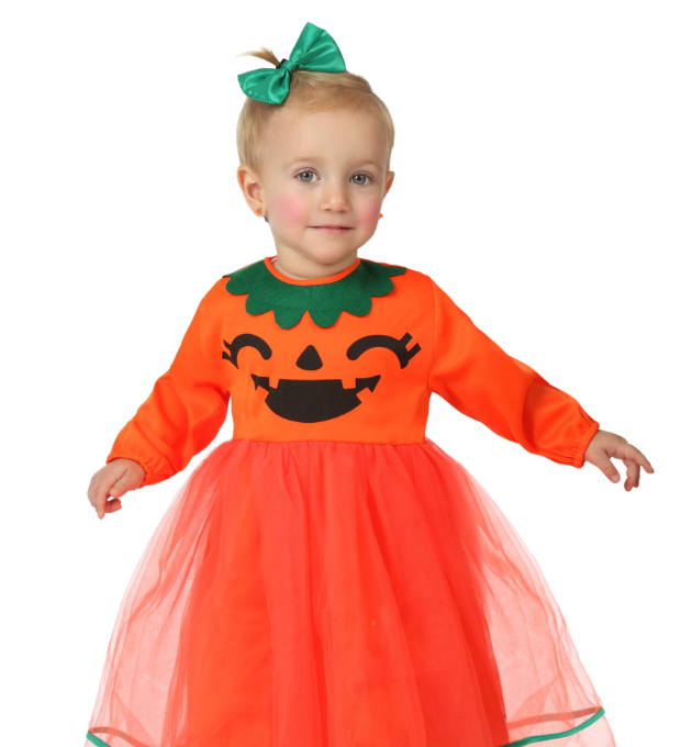 Ce déguisement de citrouille pour bébé se compose d'une robe et d'un élastique à cheveux (collants et chaussures non inclus). La robe est orange, avec un visage de citrouille souriante imprimé en noir à l'avant. Deux jupons de tulle orange sont cousus au niveau de la taille.