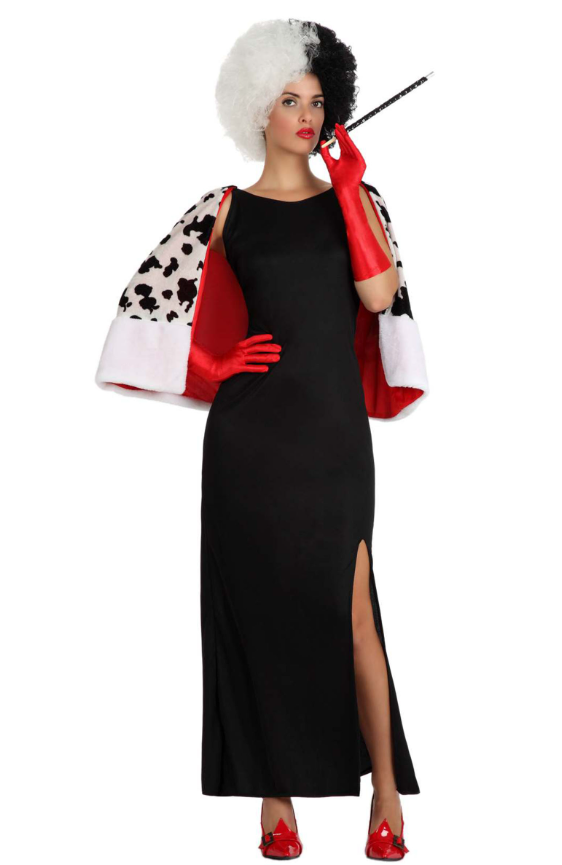 Ce déguisement de femme cruelle comporte une robe longue noire et une cape ( perruque, gants, chaussures et porte cigarette non inclus ).