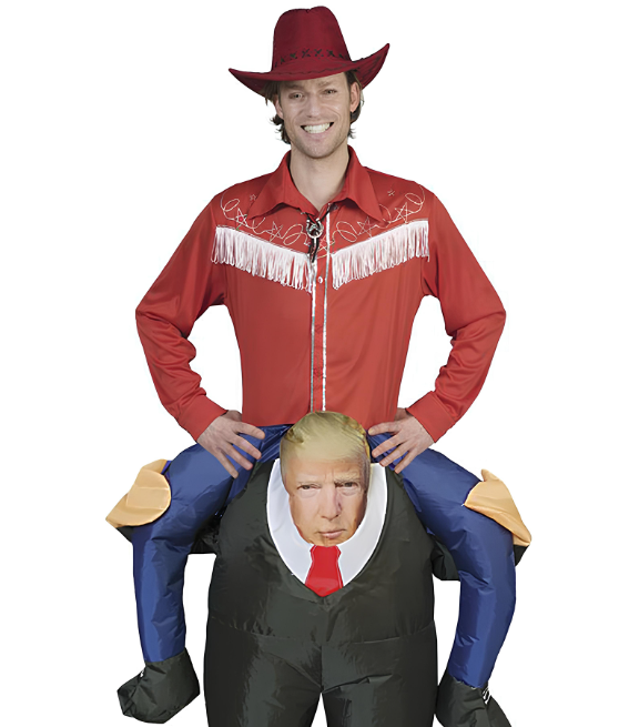 L’ensemble se compose d’un costume gonflable noir avec veste et cravate rouge, simulant un président en costume officiel, et de fausses jambes bleues qui créent l’effet visuel d’un cowboy perché sur ses épaules.