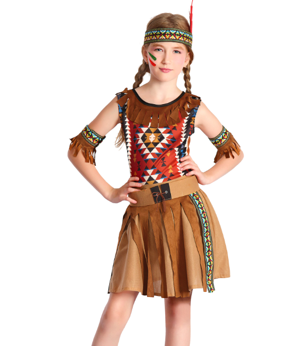 Ce déguisement d'indienne pour fille se compose d'une robe, d'une ceinture, d'un bandeau, de brassards et de bracelets de cheville. Le haut de la robe est à motifs indiens avec des franges larges au niveau du col.