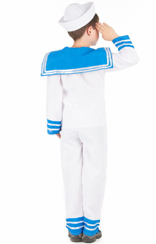 Ce déguisement de marin pour garçon se compose d'un haut, d'un pantalon et d'un chapeau (chaussures et jumelles non incluses). Le haut à manches longues est blanc. Le bas des manches est bleu avec des bandes blanches satinées.