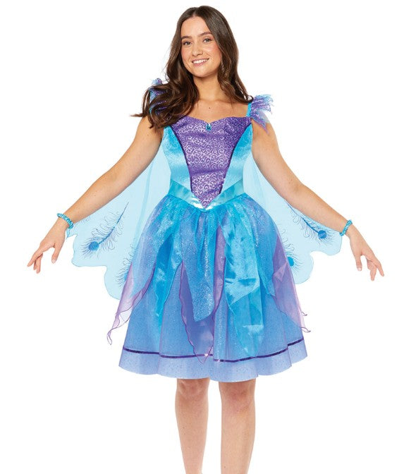 Ce déguisement Paon Élégant femme réunit une superbe robe aux nuances bleutées et violacées, ornée de détails scintillants qui évoquent les plumes majestueuses de l’oiseau. Le panneau d’ailes assorti se fixe aisément pour offrir un effet déployé très aérien, tandis que la coiffe complète l’ensemble avec une touche délicate rappelant la couronne naturelle du paon.