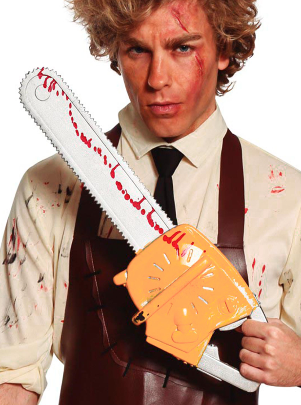 Fabriquée en plastique, elle présente une lame grise tachée de faux sang et un bloc moteur orange.