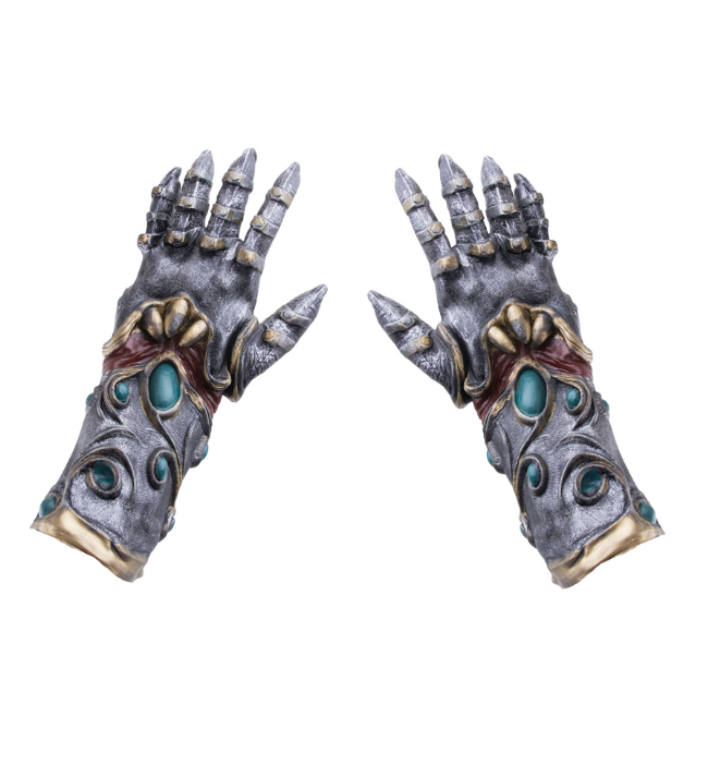 Ces gants en latex donneront l’illusion que vous portez des gantelets de chevalier. Ils sont gris acier et ornées de dorures.