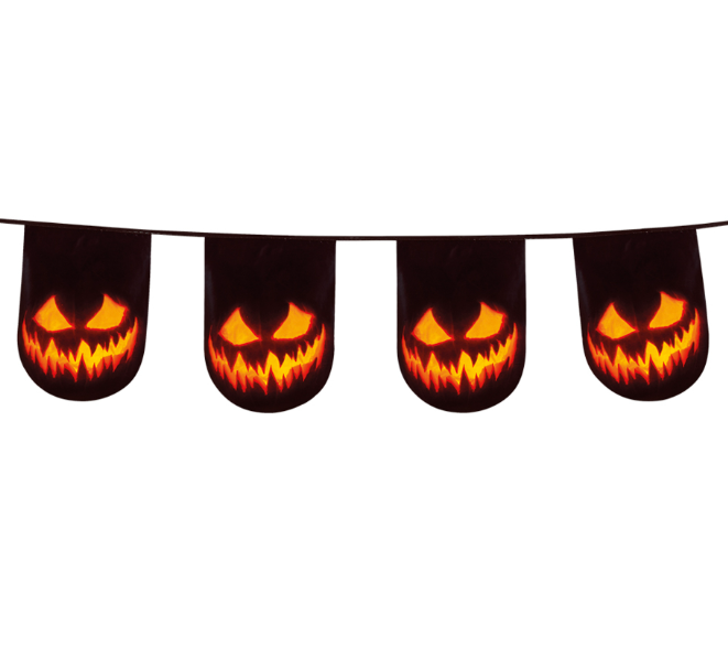 Elle se compose de 15 fanions noirs en plastique ornés d'un visage de citrouillle terrifiante.