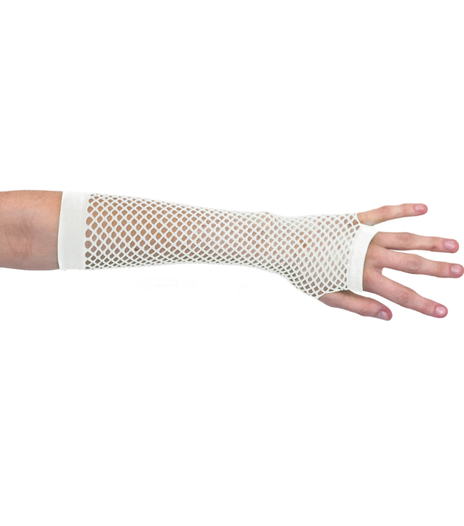 Ces mitaines résille blanches couvrent tout l'avant du bras. Elles tiennent par des élastiques aux extrémités.