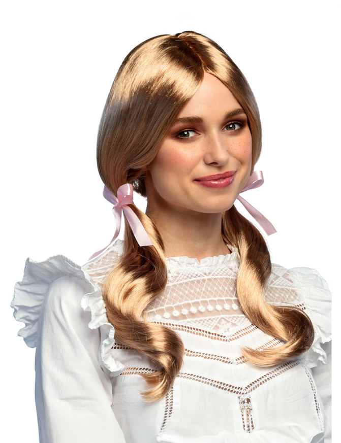 Cette longue perruque pour femme dispose de deux couettes de chaque cotés maintenu par un nœud rose. Les cheveux sont de couleur blond foncé.
