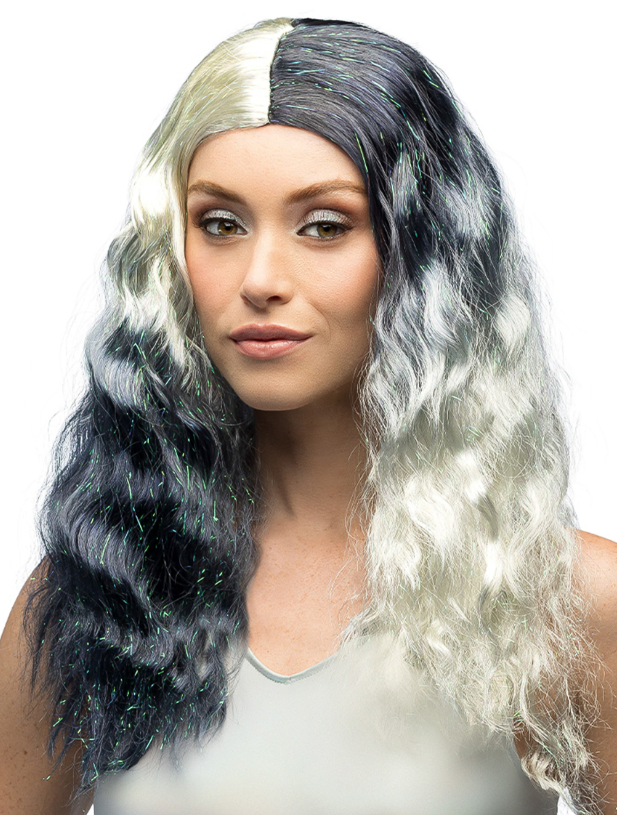 Perruque ondulée noire et blanche a reflets métalliques