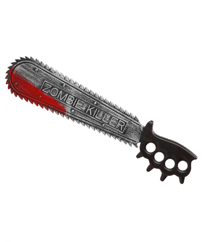 Cette scie à aspect métallique est ornée de tâches de sang et possède l'inscription "zombie killer". Vous pourrez facilement la maintenir à l'aide de trous présents pour les doigts.